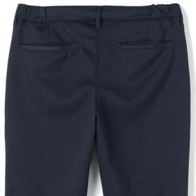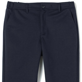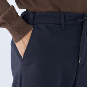 裾口に向かって緩やかに細くなっている、ゆるテーパード。2WAYドローコードとお腹周りを圧迫しないウエストゴムシャーリング仕様。股部分にはデオドラントテープを施した抗菌消臭機能付き。ポリエステル80%、コットン20%の表と裏を合わせて編まれたダブルジャージのポンチ素材を使用。2WAYストレッチでありながらハリのある生地感が特徴的で適度な厚みにより膝抜けなどがしにくく、ご家庭の洗濯機でも安心して洗うことができます。