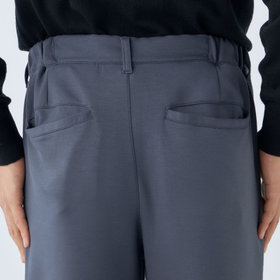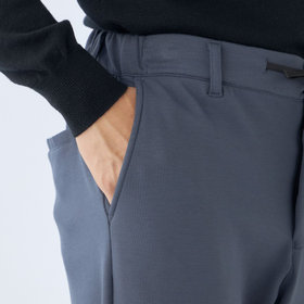 裾口に向かって緩やかに細くなっている、ゆるテーパード。2WAYドローコードとお腹周りを圧迫しないウエストゴムシャーリング仕様。股部分にはデオドラントテープを施した抗菌消臭機能付き。2WAYストレッチによるリラックスした着心地
