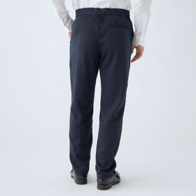 裾口に向かって緩やかに細くなっている、ゆるテーパード。2WAYドローコードとお腹周りを圧迫しないウエストゴムシャーリング仕様。つかい勝手の良い深めのサイドポケットポリエステル100%のフリース起毛素材を使用。起毛素材は繊維の間に空気層ができる為、優れた保温性。また使用するポリエステルは軽さと強度があるストレッチ素材。空気層を含み通気性があるので、速乾性が高くドライな肌触り、ご家庭の洗濯機で安心して洗えノーアイロンで着用可能です。