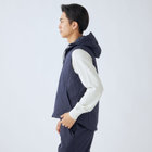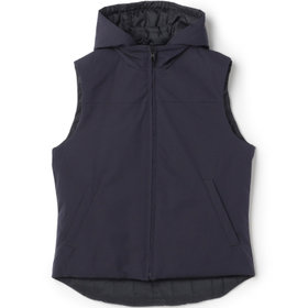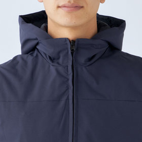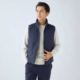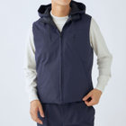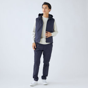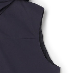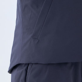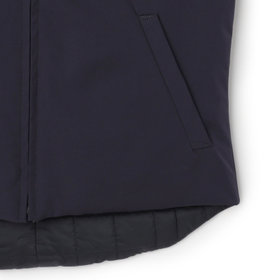 ストレッチ性と耐久性に優れたアクティブ素材を使用。ストレッチ性はタテ、ヨコに伸びる2WAYストレッチでストレスフリーな着用感。耐久性は耐摩耗試験で10万回をクリア(通常のスーツは2万回程度)とポリエステル素材の弱点である引っ掛けキズもスナッキング試験を4.5級、ピリング試験も5級+とハードな動きにも耐えうる素材です。また撥水加工を施しているために雨の日でも安心です。ベスト特徴は①リバーシブル・・・両A面使いできる素材を厳選。表地はスーツと共生地、裏面はカジュアルなキルティング素材を使用2.脱着式フード・・・フード自体もリバーシブルでの着用可能。フードを外した際、ファスナー跡も見えない工夫