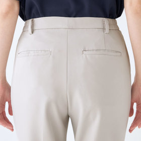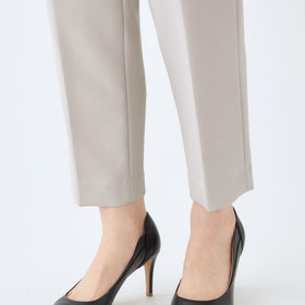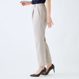 フロントにタックの入ったサイドシャーリング仕様のテーパードパンツはベーシックなデザインでON/OFF問わず着まわしが可能。ウエストの履きこみをやや深めにし、腰回りにゆとりを持たせています。