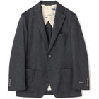 袖丈を少し短めに設定しており、SB刻印釦・専用力釦・背裏専用裏地とSB専用附属を使用しております。衿裏にはSBロゴ刺繍を施しました。デザイン・ディテール・サイジングに渡り、拘りの詰まったジャケットです。