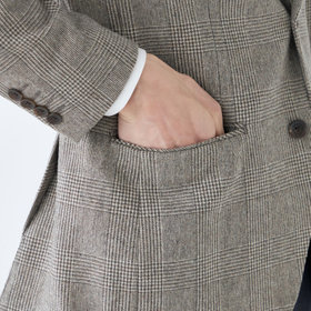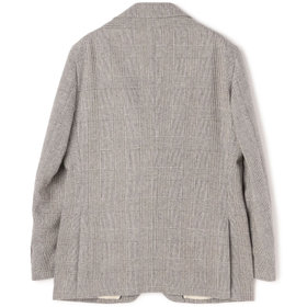 袖丈を少し短めに設定しており、SB刻印釦・専用力釦・背裏専用裏地とSB専用附属を使用しております。衿裏にはSBロゴ刺繍を施しました。デザイン・ディテール・サイジングに渡り、拘りの詰まったジャケットです。