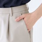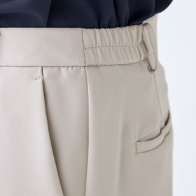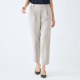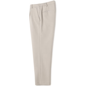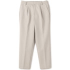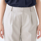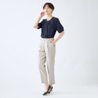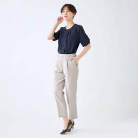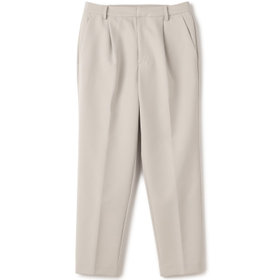フロントにタックの入ったサイドシャーリング仕様のテーパードパンツはベーシックなデザインでON/OFF問わず着まわしが可能。ウエストの履きこみをやや深めにし、腰回りにゆとりを持たせています。