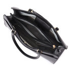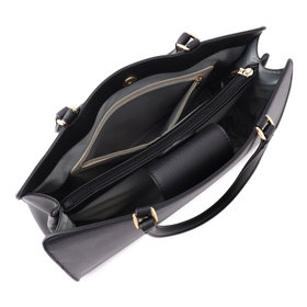シンプルで洗練されたデザインが魅力のブラックバッグ。合成皮革を使用し、上品な質感と耐久性を兼ね備えています。37㎝×12cm×27㎝のゆとりあるサイズで、書類や必需品がすっきり収まり、ビジネスシーンにも最適。どんなスタイルにも馴染むシックなデザインで、オン・オフ問わず幅広く活躍します。
