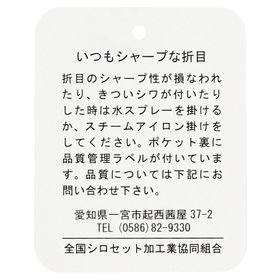 スーツやパンツのサイズ確認は、直立姿勢だけではなく、椅子に座った時の負荷。しゃがんだ時の負荷を考えたサイズ選びを必ずお願いします。ヒップ・太もも部分の生地にゆとりがない場合等の無理なサイズ選びは、体型や動きに関係なく生地や糸に負荷がかかり、「縫い目のほつれ」「生地の破れ」が起こります。また、両太もも同士が当たる場合や生地にゆとりがない場合、股ズレで生地が破れる可能性がございます。実店舗での商品確認・試着にて正しいサイズの購入をお勧めいたします。サイズが合わない事による「縫い目のほつれ」「生地の破れ」は「返品」「交換」「無償修理」はいたしかねます。また商品状態により修理が出来ない場合もございます。